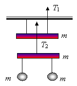 Две доски висят на нитях так, как показано на рисунке. К нижней доске подвешены два металлических шарика. Масса каждой доски и металлического шарика m. Определите отношение сил натяжения Т2 : Т1 . (Т1 и Т2 - силы натяжения каждой из нитей, на которых висят верхняя и нижняя доски).![]() |