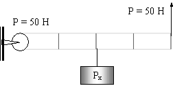 Один конец стержня весом P = 50 Н закреплён шарнирно, а к другому концу привязана нить с грузом Р = 50 Н, перекинутая через неподвижный блок. Груз какого веса Рх должен быть подвешен в точке О, чтобы стержень находился в горизонтальном равновесии ?![]() |