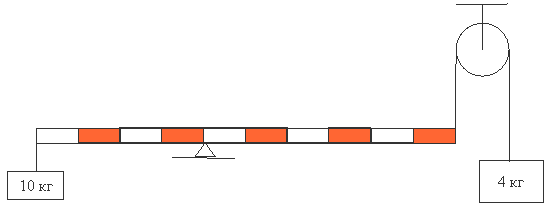 Куда должен быть подвешен груз массой 10 кг, чтобы блок, приведённый на рисунке, находился в равновесии ?![]() |