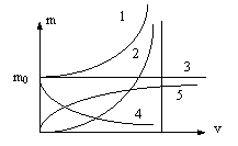 Какой из пяти графиков, показанных на рисунке, правильно выражает зависимость массы от скорости? |