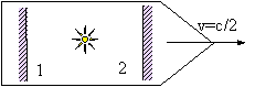В середине космического корабля, летящего со скоростью , произошла вспышка света. Каково отношение времени распространения света до зеркала 2 ко времени распространения света до зеркала 1, если эти времена измерены космонавтом, находящимся в середине корабля? |