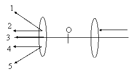 Две собирающие линзы расположены так, как показано на рисунке. В точке О расположены фокусы линз. На правую линзу параллельно оптической оси падает луч. В каком из направлений, указанных на рисунке, будет распространяться луч пройдя вторую линзу?![]() |