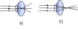На рисунке приведены две схемы (а,б) хода лучей в глазе. Какая из схем соответствует близорукости и какую линзу необходимо использовать для очков в этом случае?![]() |