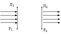 Лучи света падают параллельно главной оптической оси на линзу с фокусным расстоянием F1 и, пройдя через линзу с фокусным расстоянием F2, продолжает распространяться параллельно главной оптической оси. Каково расстояние между линзами?