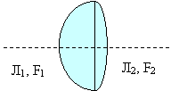 Две линзы, имеющие фокусные расстояния F1 = 0,5 м и F2 = 1 м, соответственно, соединены как показано на рисунке. Какова оптическая сила полученной системы линз (в диоптриях)?![]() |
