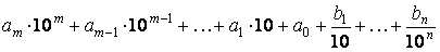 Если bl = b2 = = bn = 0, то (9) есть целое число. При аm = аm-1 = = a0 = 0 дробь (9) называется правильной десятичной дробью. В общем случае, когда не все аm, аm-1, а0 и не все bn, bn-1, b1 равны нулю, дробь (9) называется смешанной.