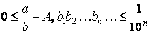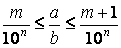 Если b ≠ 2k·5l, то дробь – можно приближенно обратить в конечную десятичную дробь с точностью до 10-n с недостатком или избытком. Для этого надо найти две конечные десятичные дроби, удовлетворяющие условию