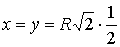 (α = 45°). В этом случае прямоугольный треугольник ОВС-равнобедренный (смотри рисунок.), т. е. х = у, и так как х2 + у2 = R2, то