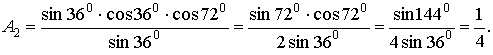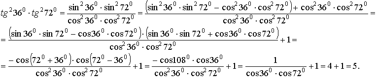 то тогда удается путем различных преобразований свести эту задачу к вычислению выражения cos 36°·cos 72°, которое равно 1/4 (см. пример 3).Пример 6. Вычислить без таблиц выражение tg2 36°·tg2 72°.