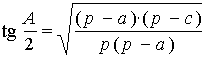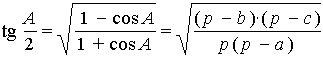 Весьма полезной при решении задач является следующая формула, выражающая тангенс угла через стороны треугольника. Последняя в отличие от формулы косинусов приведена к виду, удобному для логарифмирования.