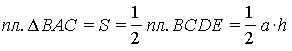 Доказательство. Допустим для простоты, что углы В и С - острые. Дополним данный треугольник до прямоугольника BCDE с основанием а и высотой h. Прямоугольник BCDE составлен из четырех треугольников BEA, BAF, FAC и CAD, причем Δ BEA = Δ BAF, а Δ FAC = Δ CAD. Согласно свойствам 3 и 1