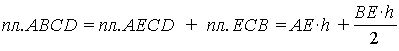 Доказательство. Проведем из вершины С отрезок СЕ, параллельный стороне AD. Он разобьет трапецию на параллелограмм AECD и треугольник ЕСВ с высотами, равными h. Следовательно,