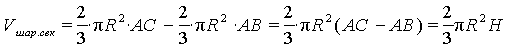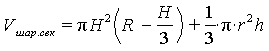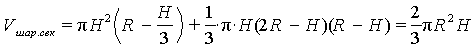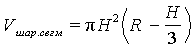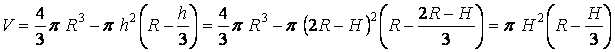 Объем V такого шарового сегмента можно получить как разность между объемом шара и объемом V1 сегмента с высотой 2R - H = h, где h < R. Тогда