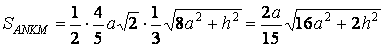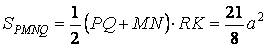 Для того чтобы найти точки пересечения секущей плоскости с ребрами SF и SC, продолжим ребра основания EF и DC до их пересечения с продолжением ребрами в точках Р и Q; Р соединим с М, а Q – с N. Прямая РМ пересечет ребро SF в точке Т, а прямая QN – ребро SC в точке G. Соединив Т с A и G с В, получим искомое сечение – шестиугольник ABGNMT. Его площадь равна разности между площадью трапеции PMNQ и площадью двух равных треугольников РТА и BGQ. Далее PQ = 3a, так как треугольники AFP и BGQ – равносторонние {