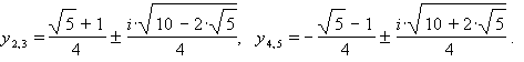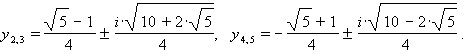 Решение. Имеем y5 - 1 = (y - 1)·(y4 + y3 + y2 + y) = 0. Следовательно, уравнение y5 -1 = 0 равносильно совокупности двух уравнений: а) y - 1 = 0, откуда y1 = 1, и б) y4 + y3 + y2 + y + 1 =0 - симметрическое уравнение. Разделив на y2, получим равносильное уравнение