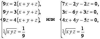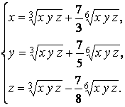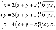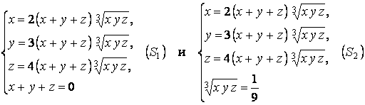 . Раскрывая скобки в левой части, после упрощения получим t ² = 1, откуда t = 1 ( t = - 1 < 0 – не годится). Подставляя найденные значения t впервые три уравнения последней системы, получим решения данной системы: (0; 0; 0) и