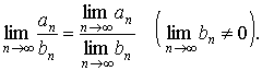 - Предел отношения двух последовательностей равен отношению пределов числителя и знаменателя, если последние существуют и предел знаменателя не равен нулю, т. е.