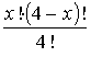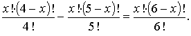 Так как 0 < х < 4 (х = 0 и х = 4 не удовлетворяют уравнению) и (6 - х)! = (6 - х)·(5 - х)·(4 - x)!, то после сокращения на
