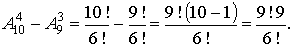 Решение. Всего различных комбинаций из четырех карточек можно составить столько, сколько существует размещений из 10 элементов по 4. Но условиям задачи не удовлетворяют комбинации цифр, начинающихся нулем. Таких комбинаций будет