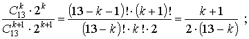 для всех k = 0, 1, 2, ..., 13. Беря отношение коэффициентов предыдущего и последующего членов, имеем