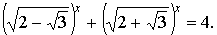 А ах + В bх = С (17) (или А ах + В bx = С сх, сводящееся к первому делением на сх ≠ 0). В некоторых случаях это уравнение удается свести к алгебраическому уравнению относительно нового неизвестного. Например, если ab = l, то заменой ах = у (тогда bх = 1/y) уравнение (17) сводится к квадратному уравнению А у2 - Су + В = 0. Если b = аm (m - целое), то той же заменой уравнение (17) сводится к алгебраическомуА у + В уm = С. Пример 5. Решить уравнение Решение. Замечая, что