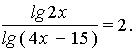 lg 2 x = lg (4 x - 15)2 при условии, что 4 x - 15 > 0 и 4 х - 15 ≠ 1.