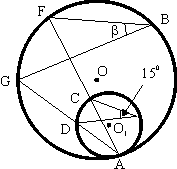 Две окружности с центрами в точках О и О1 касаются внутренним образом в точке А. Угол, образованный хордами СЕ и DE окружности с центром в точке О1 равен 15°. Найдите градусную меру угла, обозначенного буквой β.