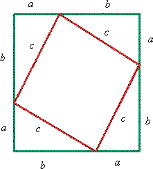 квадрата со стороной a + b равна сумме площадей четырёх рассматриваемых прямоугольных треугольников и площади квадрата со стороной с: