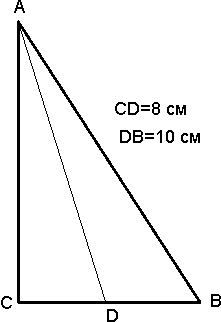 - Биссектриса острого угла прямоугольного треугольника делит противолежащий катет на части в 8 см и 10 см. Найти гипотенузу.