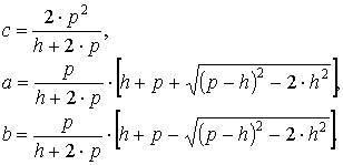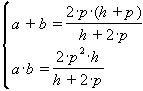 Из обозначений задачи следует a + b + c = 2·p. Отсюда a + b = 2·p - с. Возведём обе части последнего равенства в квадратa² + b² + 2·a·b = 4·p² - 4·p·c + c². По теореме Пифагора a² + b² = c² и поэтомус² + 2·a·b = 4·p² - 4·p·c + c². илиa·b = 2·p² - 2·p·c. По формуле вычисления площади прямоугольного треугольника имеем a·b = c·h и поэтомус·h = 2·p² - 2·p·c. откуда Используя полученное выражение и вышеприведённые данные, запишем систему уравнений