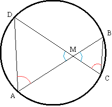 Доказательство. Выберем произвольную точку М внутри окружности и через эту точку проведём две произвольные хорды АВ и CD. Соединим точки С и В, а также А и D. Треугольник МАD и треугольник МСВ побобны по углам: если два угла одного треугольника равны двум углам другого треугольника, то эти треугольники подобны. В данном случае ∠ BAD = ∠ DCB как вписанные углы окружности опирающиеся на одну и ту же дугу, ∠ СМВ = ∠ DMA как углы вертикальные. В потобных треугольниках отношения соответствующих сторон равны