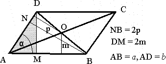 - В параллелограмме даны острый угол α и расстояние m и р от точки пересечения диагоналей до неравных сторон. Определить диагонали и площадь параллелограмма.Консультация
