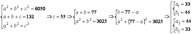 - Периметр прямоугольного треугольника равен 132, а сумма квадратов сторон треугольника – 6050. Найти стороны.
