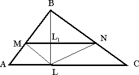 Площадь четырёхугольника не зависит от положения точки L на основании большего основания. Введём обозначения SMBN = q, SABC = S, MN = a1, BL = H, BL1 = h2. Так как диагонали четырёхугольника взаимно перпендикулярны, то площадь четырёхугольника равна половине произведения его диагоналей Так как