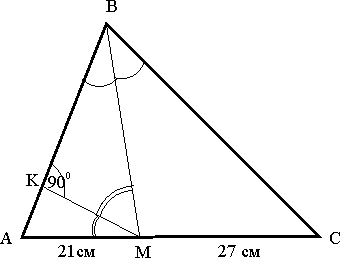 - Биссектриса угла В пересекает сторону АС треугольника АВС в точке М и делит её на отрезки АМ = 21 см и СМ = 27 см. Найдите периметр треугольника АВС, если биссектриса угла АМВ перпендикулярна прямой АВ. Консультация