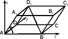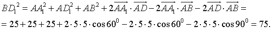 Выполним рисунок задачи. ABCDA1B1C1D1 – параллеллепипед, ABCD – квадрат, Ð A1AB = Ð A1AD = 60°, AB = AD = AA1 = 5. Найти длину диагонали BD1.Для решения задачи воспользуемся методом координат. Введём систему координат: начало координат возьмём в вершине А, оси Ах и Ay направим по сторонам квадрата AB и AD, ось Az направим перпендикулярно плоскости квадрата как показано на рисунке.