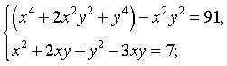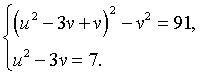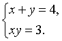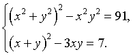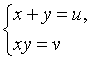 Данная система относится к классу симметричных систем, то есть систем, вид которых не меняется при замене x на y и y на x. В таком случае необходимо преобразовать уравнения системы к специальному виду с последущей заменой x + y = u, x·y = v.