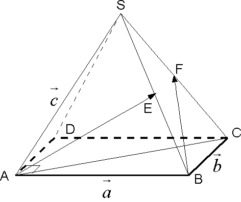 О т в е т: 60°. - В правильной четырехугольной пирамиде SABCD, все ребра которой равны 1, точки Е, F — середины ребер соответственно SB и SC. Найдите косинус угла между прямыми АЕ и BF. Решение.