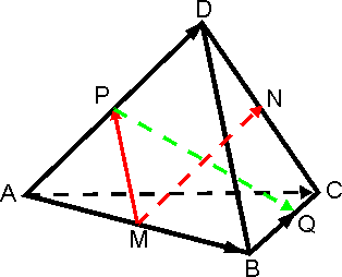 - Точки M и N – середины тетраэдра (см. рисунок), точки P и Q расположены на рёбрах AD и BC так, что отрезки MN и PQ пересекаются, а | AP | : | AD | = 2 : 3. Найти отношение | BQ | : | BC |.