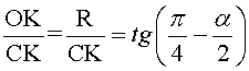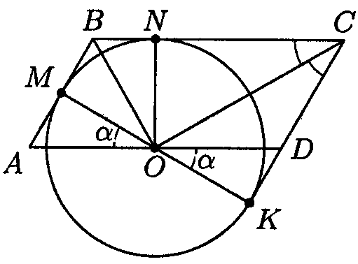 Выполним рисунок задачи. Пусть AB = CD = a, AD = BC = b, Ð MOA = α, S – площадь параллелограмма. Из рисунка и из условия задачи следует, что Ð MAO = π/2 - α, Ð ABC = π − π/2 + α = π/2 + α, Ð MBO = π/4 + α/2, Ð BCD = Ð BAO = π/2 + α, Ð OCK = π/4 − α/2 .Так как Δ AMO = Δ DKO, то AO = b/2. Далее имеем S = 2a R = b R,ткуда
