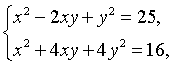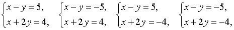 Первая система совокупности (3) имеет решение ( 14/3; − 1/3 ). Вторая система совокупности (3) имеет решение ( − 2; 3 ). Третья система совокупности (3) имеет решение ( 2; − 3). Четвёртая система совокупности (3) имеет решение ( − 14/3; 1/3 ). Условию x > y обладают решения ( 14/3; − 1/3 ) и ( 2; − 3).