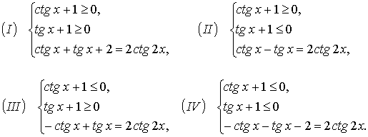 решения уравнения 2·tg2x + 2·tg x + 1 = 0. Но это уравнение не имеет действительного решения. Таким образом, система (I) решения не имеет.Вторая система приводит к нахождению в интервале